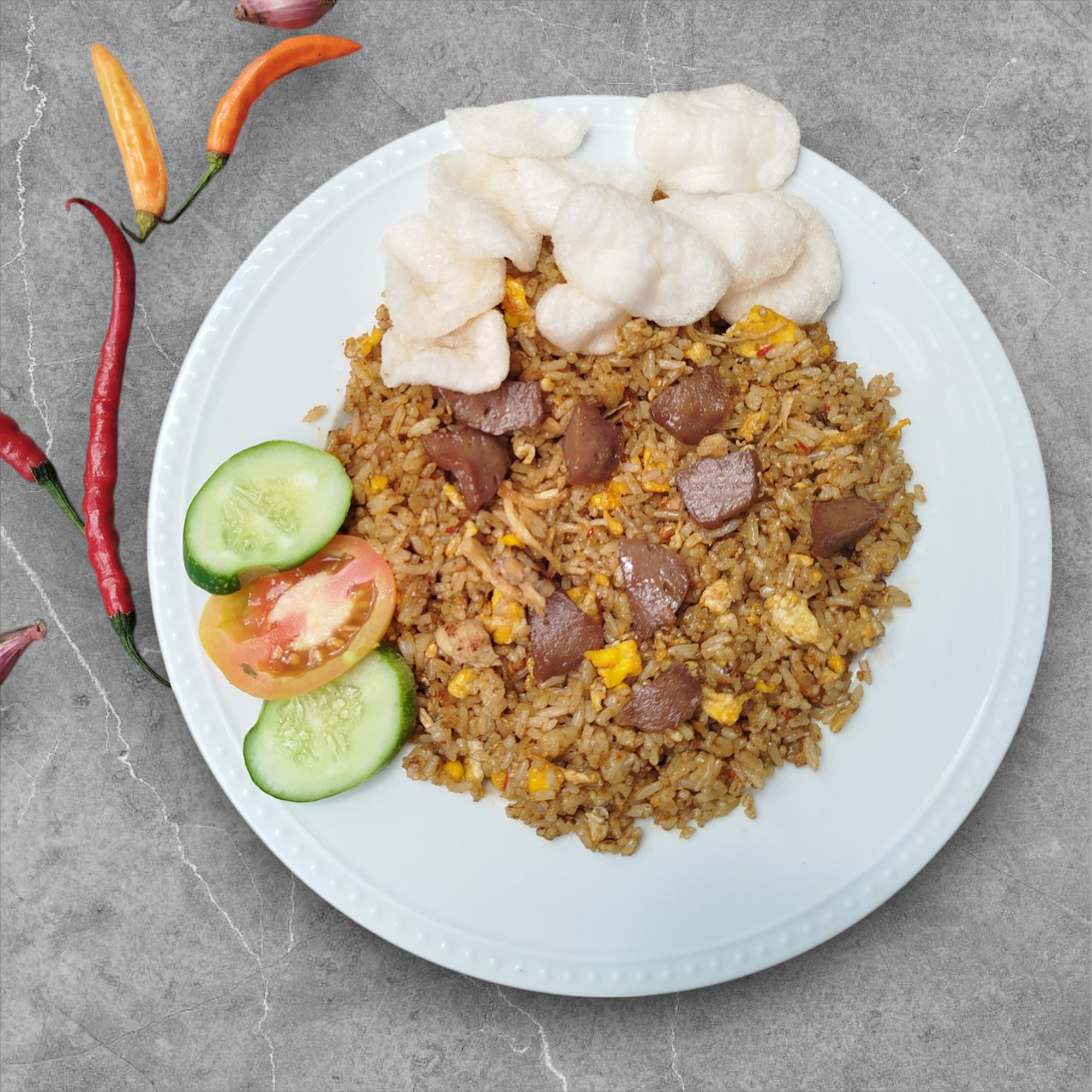 nasi goreng dengan kombinasi telur orak arik di tambahkan baso