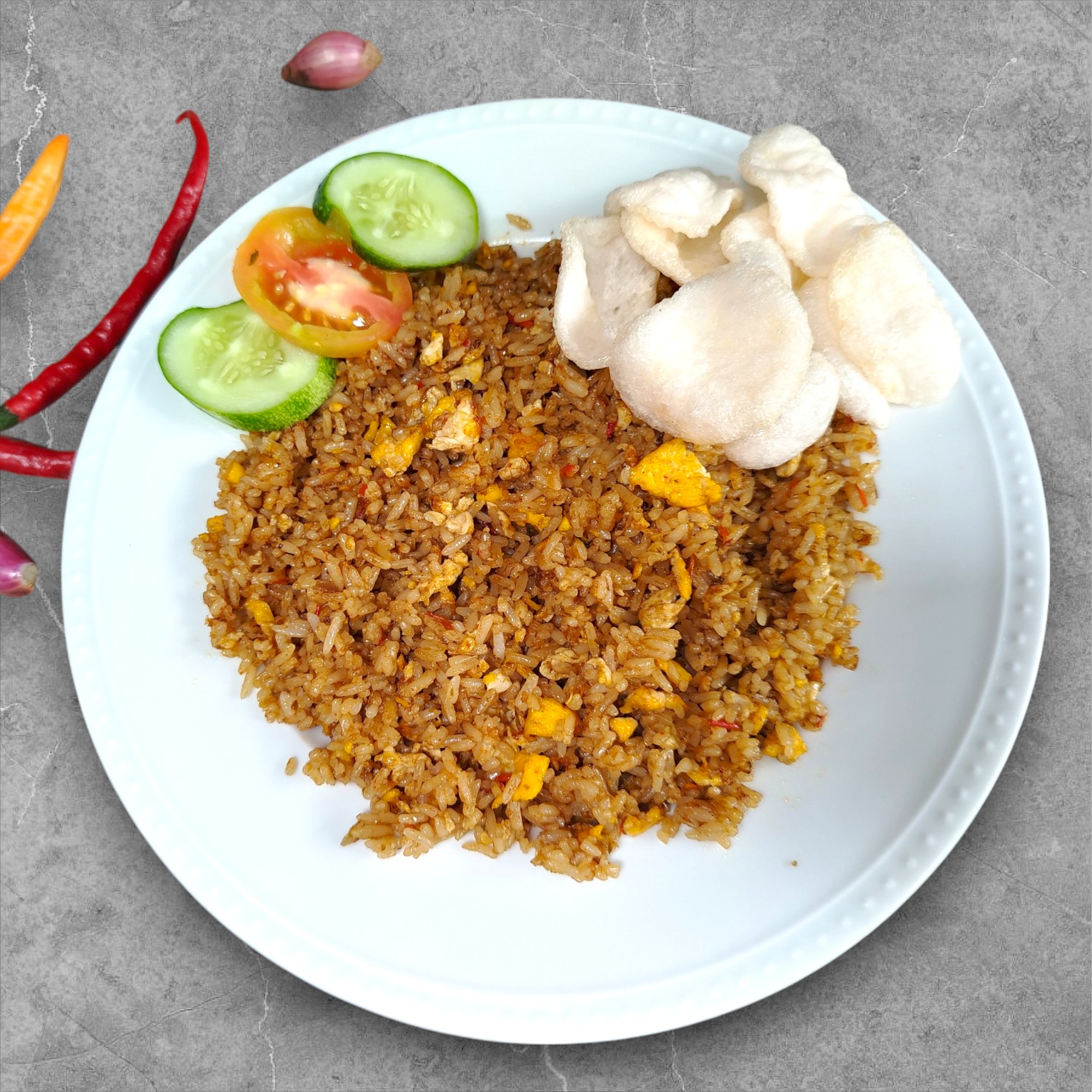 dengan tambahan topping timun, tomat, dan dilengkapi kerupuk
