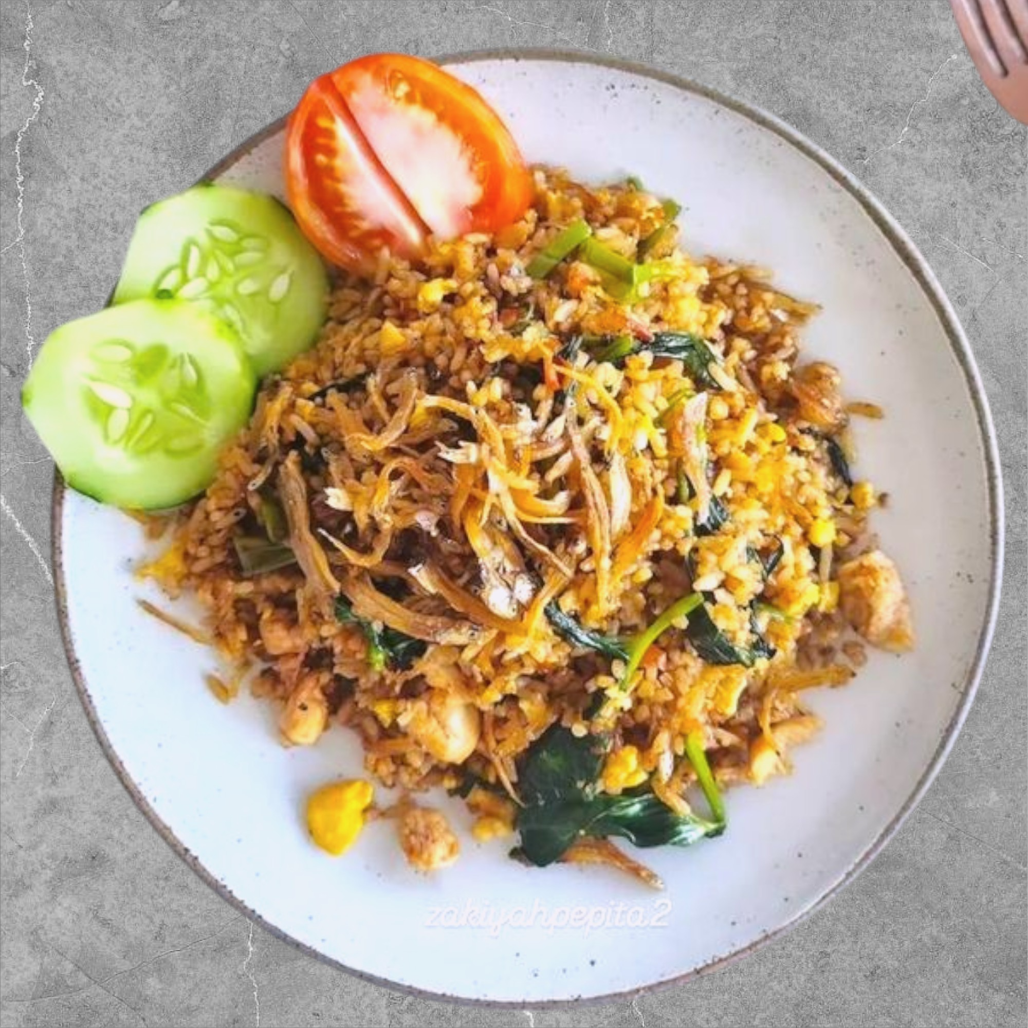 Nasi goreng dengan kombinasi telur orak arik dengan tambahan ikan teri